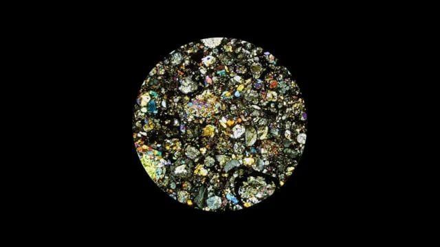 Des météorites et de roches lunaires vues à travers un microscope se transforment en un paysage interstellaire.